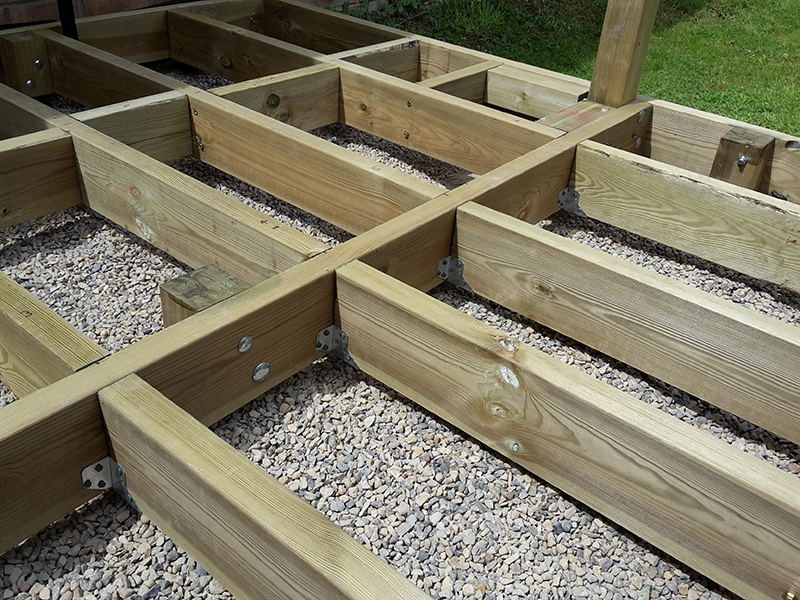 Heavy duty weed suppressing membrane and a layer of 10mm gravel was laid down before 6” x 2” joists were used to construct a strong framework with noggins added to give extra rigidity. Additional framing needed to be included to allow removable sections of decking to be fitted to provide access to drain covers.