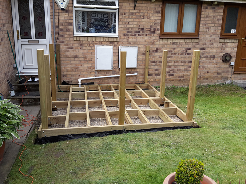 Heavy duty weed suppressing membrane and a layer of 10mm gravel was laid down before 6” x 2” joists were used to construct a strong framework with noggins added to give extra rigidity. Additional framing needed to be included to allow removable sections of decking to be fitted to provide access to drain covers.