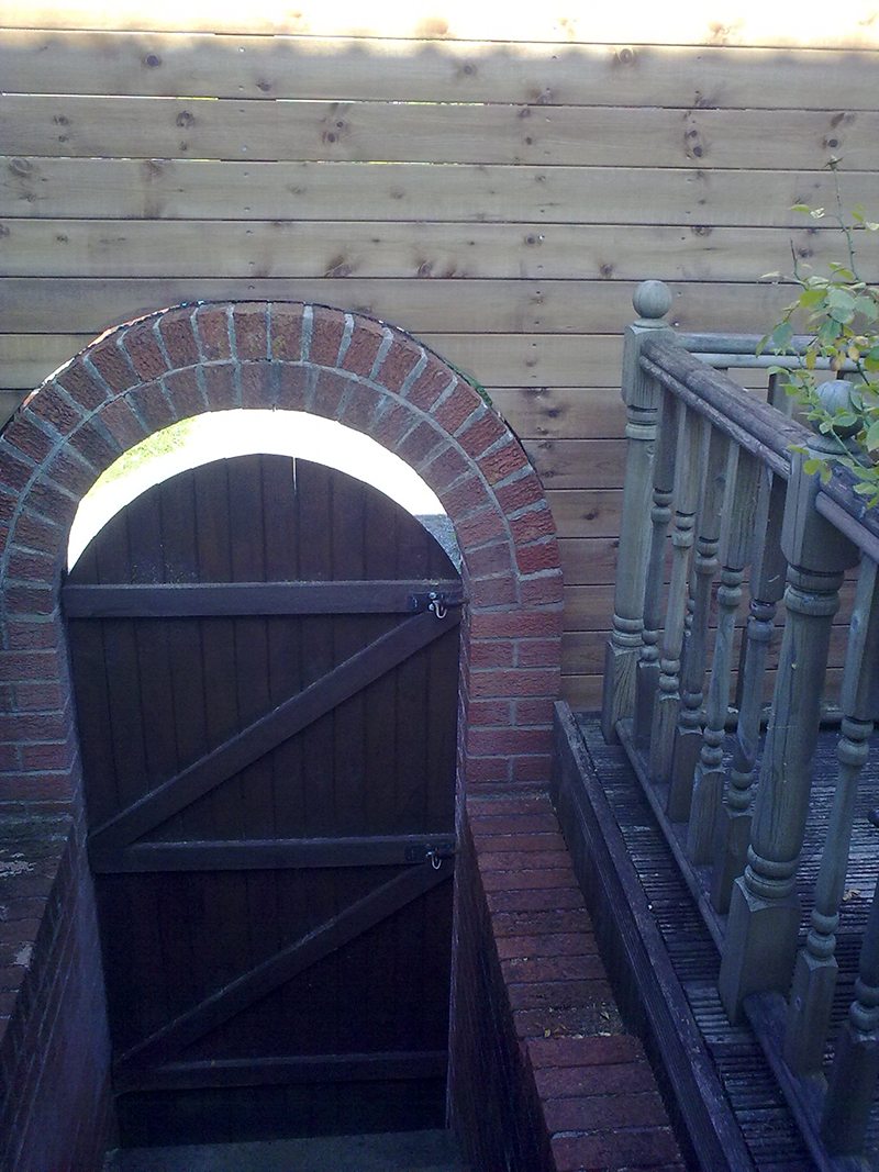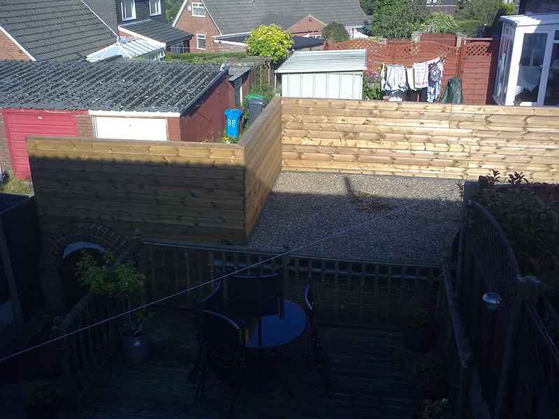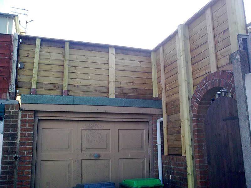 An unusual installation with the garage roof being only slightly higher than garden level and the garden itself raised above the back access road with stairs leading down to the back access. Long posts, bolted to the lower boundary wall along with bolt down post supports along the edge of the garage roof provided support for the fence boards with the whole fence being tied in to existing concrete posts to give an extremely strong structure which has already resisted several bouts of gale force winds with no ill effects whatsoever.